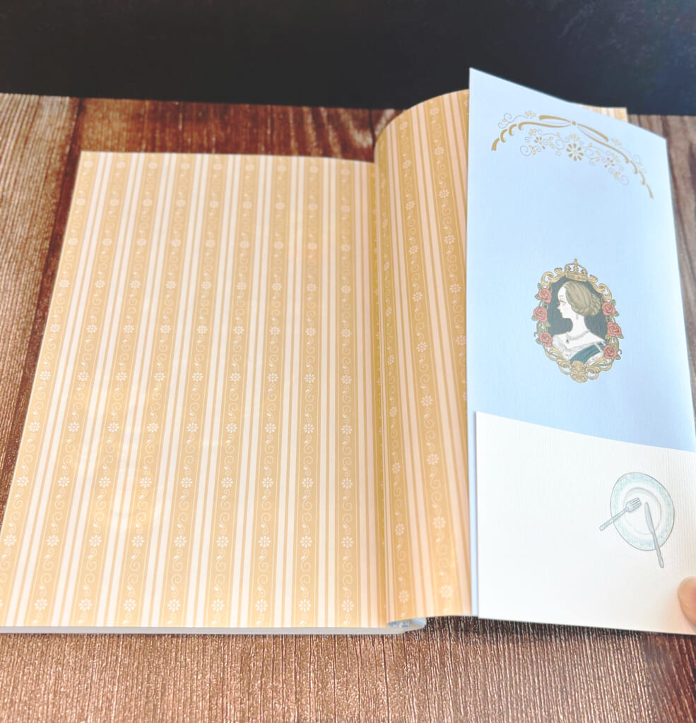 ▲本のカバーを外した本体表紙も、クラシカルロリータをイメージした可愛いデザイン。内側までおしゃれにドレスアップするのが、令嬢のたしなみです。