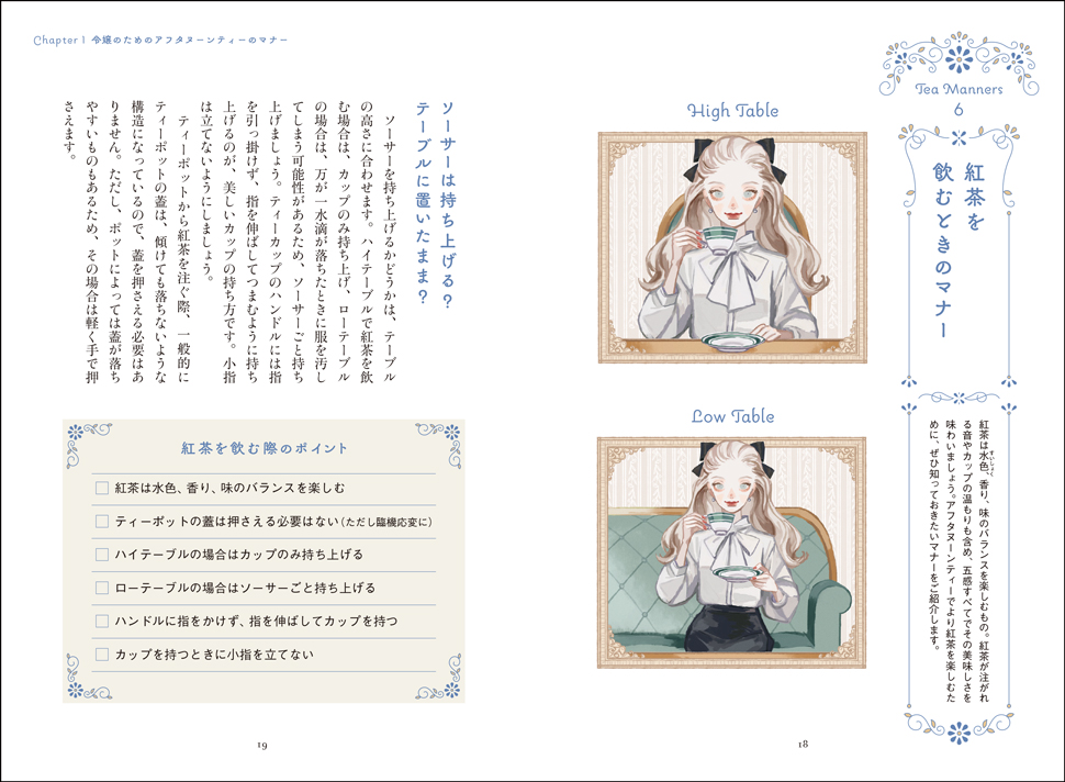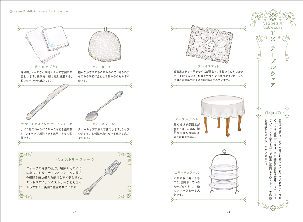 <Chapter2>「令嬢らしいおもてなしのマナー」では、美味しい紅茶の淹れ方や、ウェッジウッドをはじめとする世界の有名な茶器ブランド、そろえておきたいテーブルウェアのほか、英国流の季節ごとのおもてなし、招待やお呼ばれの際のマナーなど、自宅でも「お嬢様」気分で楽しめる知識をイラストたっぷりで紹介します。