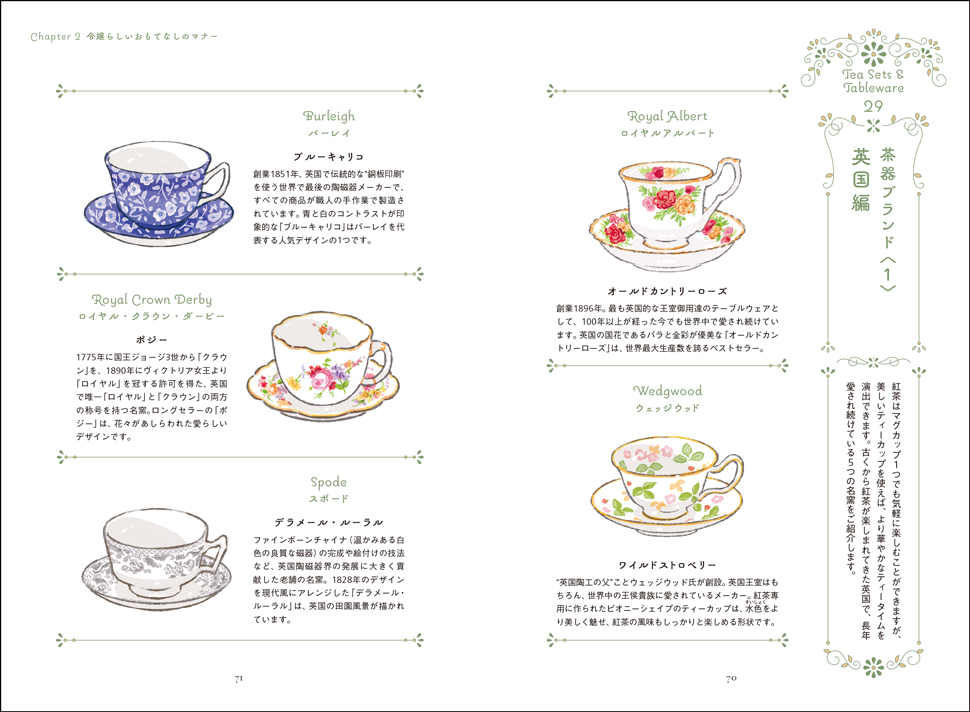 ▲紅茶好きなら知っておきたい、有名なティーカップブランドを素敵なイラストで多数紹介。