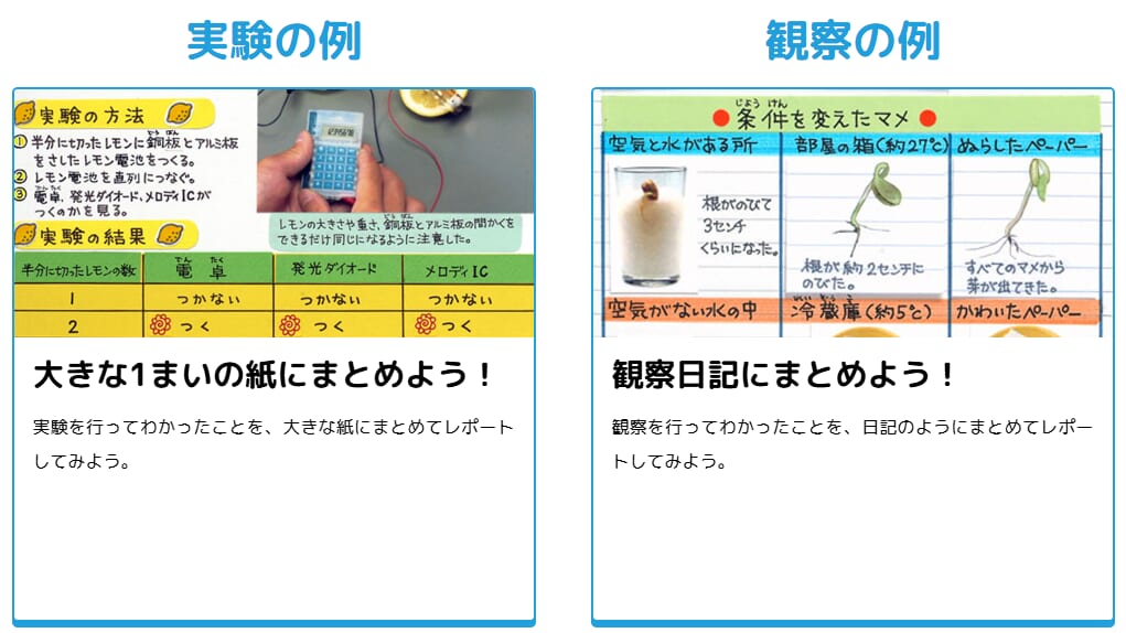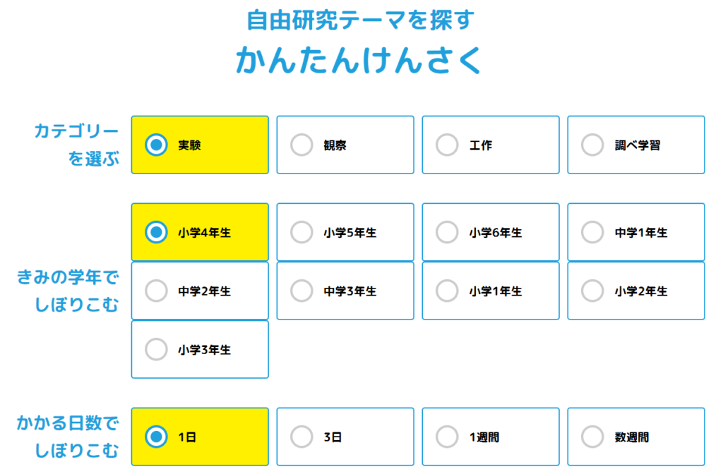 「何を研究したらいいの?」とテーマ選びに悩む子どもたちのために、500を超える研究テーマを掲載。「実験」「観察」「工作」「調べ学習」のカテゴリに加え、「対象学年」や「かかる日数」で絞り込み検索ができるため、お子様にぴったりのテーマがきっと見つかります。
