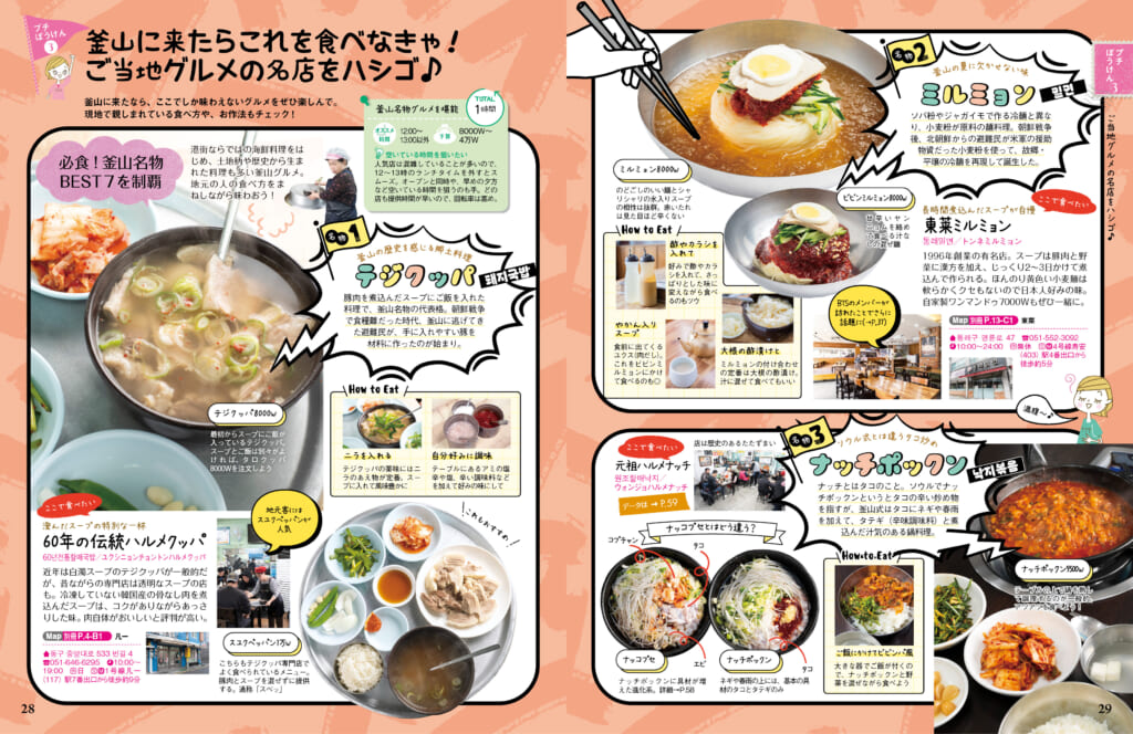 港街・釜山でしか食べられない! デジクッパ、ミルミョン、ナッコプセなど、ここならではのグルメもたっぷりご紹介。女子旅やカップル旅にマストの絶景海カフェやナイトバーも特集! さらに、初心者にとっては難しいと思われがちな市場や屋台を取材スタッフが実際に体験し、リアルな感想やコツも掲載しています。