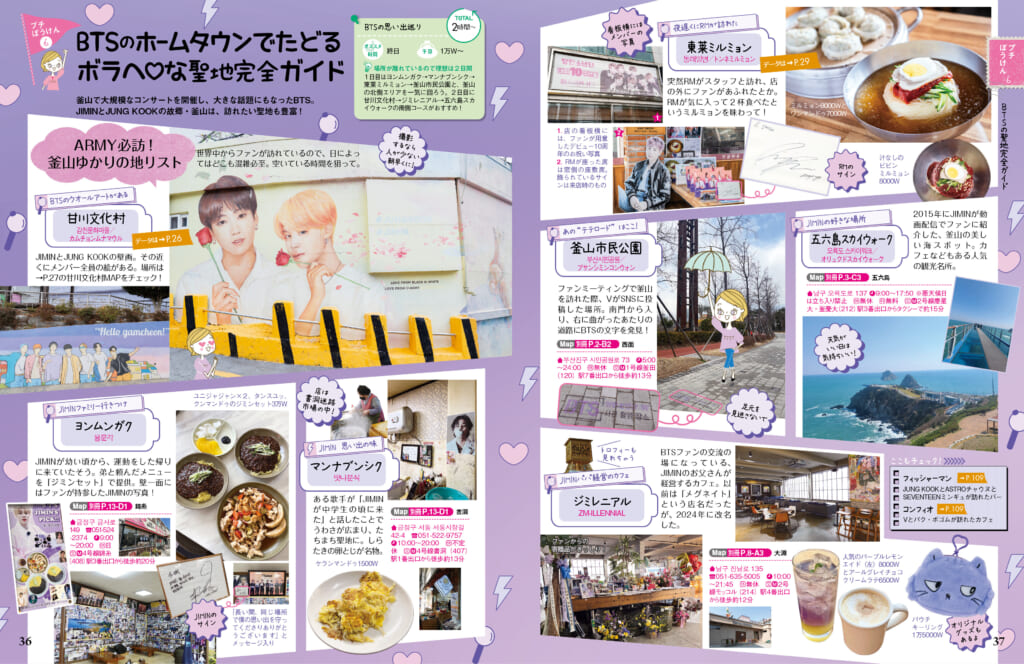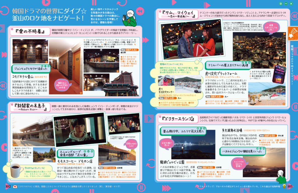 『愛の不時着』『財閥家の末息子』『サム、マイウェイ』『ドクタースランプ』『私の夫と結婚して』などの大ヒット韓国ドラマのロケ地を大紹介。さらに、釜山はいまやワールドスターとなったBTSのJIMINとJUNG KOOKの故郷ということもあり、メンバーが訪れたスポットもたくさん! そのほかにもNCTやNiziUなどのアイドルや俳優のVlogやSNSなどで登場したお店やメニューを徹底調査しました。