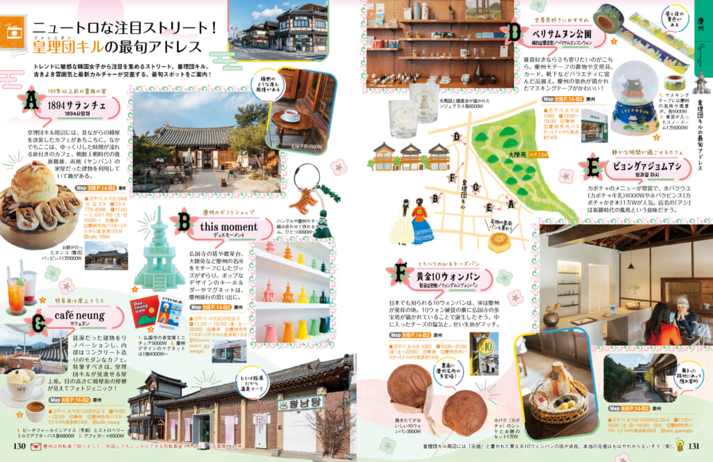 釜山から1時間で行けちゃう、歴史的な遺跡が残る慶州を16ページにわたって特集! 世界遺産はもちろん、近年レトロな雰囲気が韓国女子に注目されている、おしゃれな韓屋のカフェや宿も紹介。