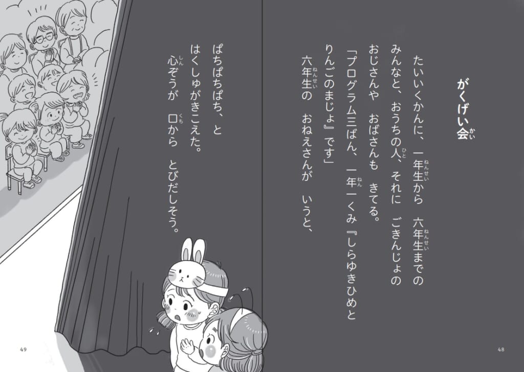 きょうの5時間目は、がくげい会でやる『しらゆきひめ』のげきの役ぎめ。いちばん人気の、しらゆきひめの役に手をあげた子は5人もいて、もちろん、その中にはクラスの「女王さま」もいて……!? プッと笑えてやさしくなれる、友だちとの物語、第5弾。