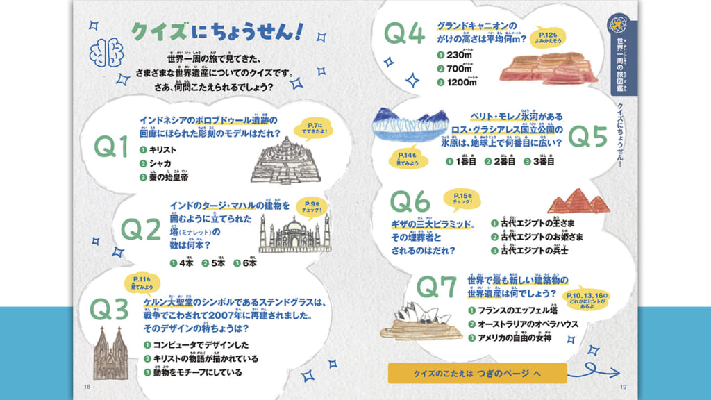 世界一周の旅で見てきた内容をもとにした世界遺産クイズもあります。