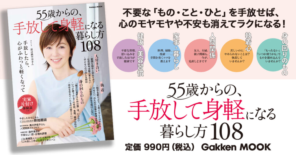 暮らしの中でついため込んでしまいがちなものも、心の中の思い込みや執着も、家事の手間も、じつはめんどうだと思っていた人間関係も、美容や健康への執着も、この機会にキレイさっぱり手放して、人生後半、軽やかに進みましょう!