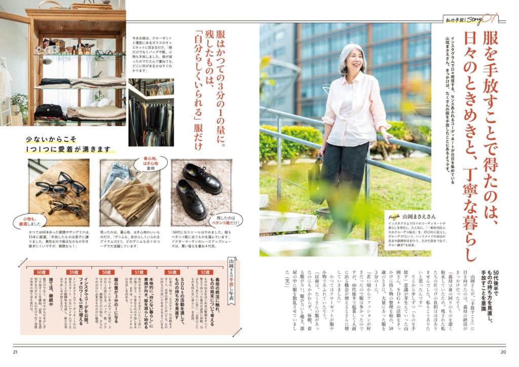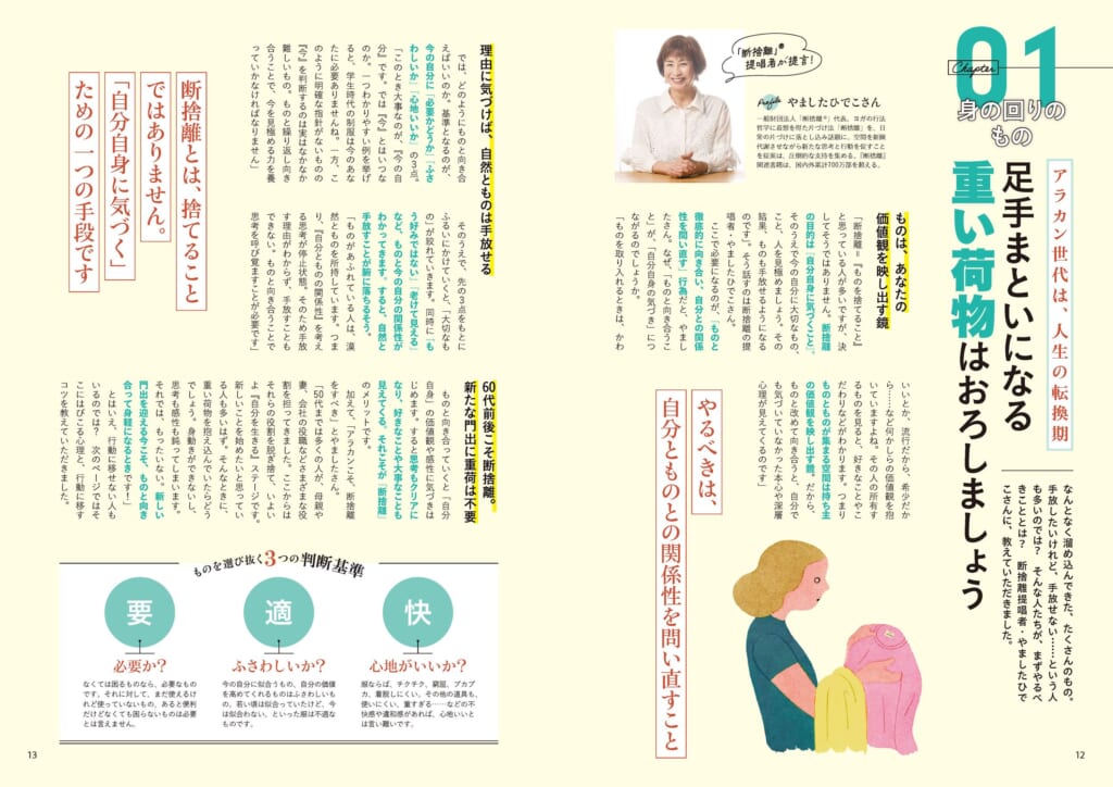 断捨離提唱者のやましたひでこさんをはじめ、ごみ清掃芸人・マシンガンズ滝沢秀一さん、料理研究家・藤井恵さんら専門家ならではのしっかりしたアドバイスや、同世代インフルエンサー、読者の方々のリアルな手放し体験談を<身の回りのもの><執着心><人間関係><家事・暮らし><健康・美容習慣>と5つのテーマに分けて、たっぷりとご紹介。どこから読んでも、”じょうずにスッキリ手放す”ためのコツやヒントがきっと見つかる。そんな一冊になっています。
