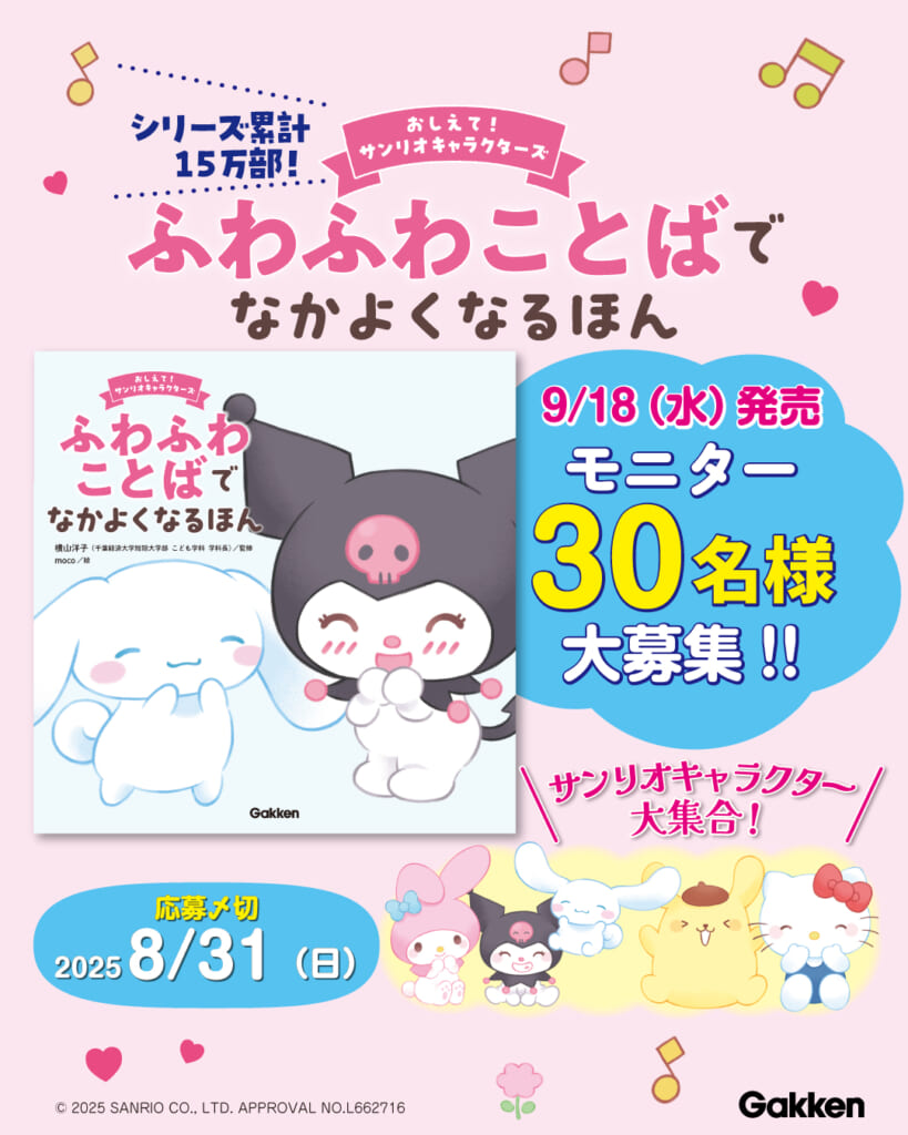 シリーズ累計15万部突破!『おしえて!サンリオキャラクターズ ふわふわことばでなかよくなるほん』のモニター募集SNSキャンペーンを開催いたします。