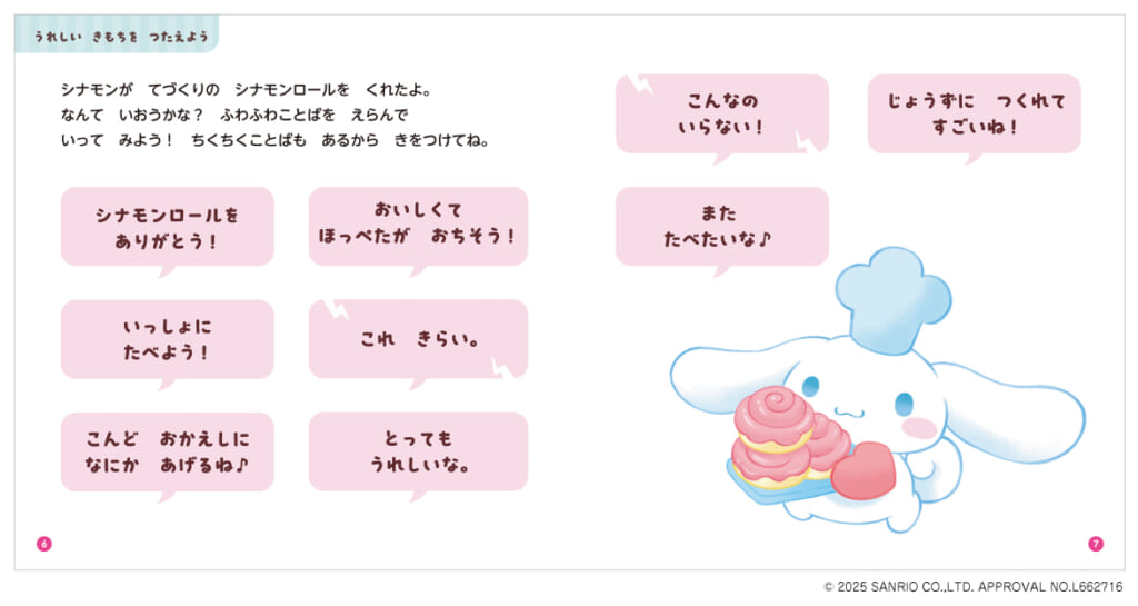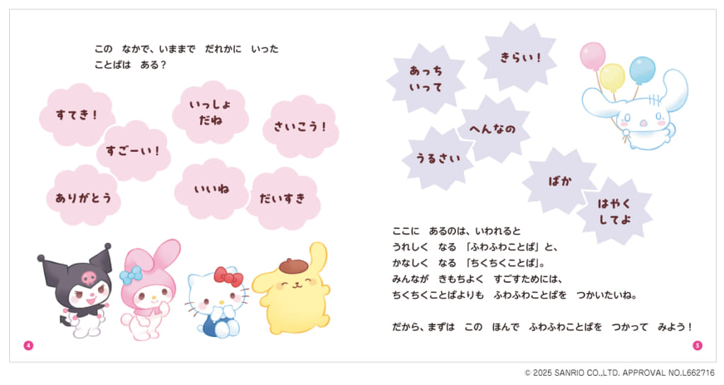 この絵本では、シナモン、クロミ、マイメロディ、ポムポムプリン、ハローキティと一緒に、言われた人がうれしくなる「ふわふわことば」と、悲しくなる「ちくちくことば」の違いを学べます。