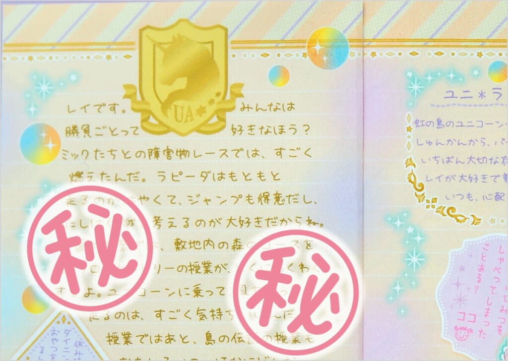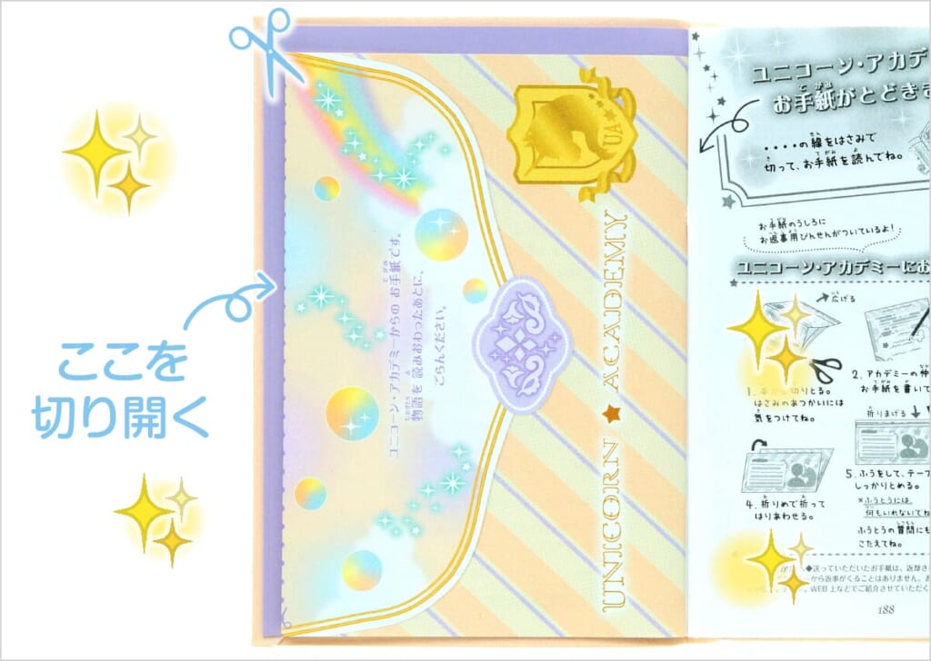 また、本の最後には、「ユニコーン・アカデミー」からのお手紙がはさまっていて、レイやラピーダ、ルームメイトたちからのメッセージがぎゅっとつまっています!