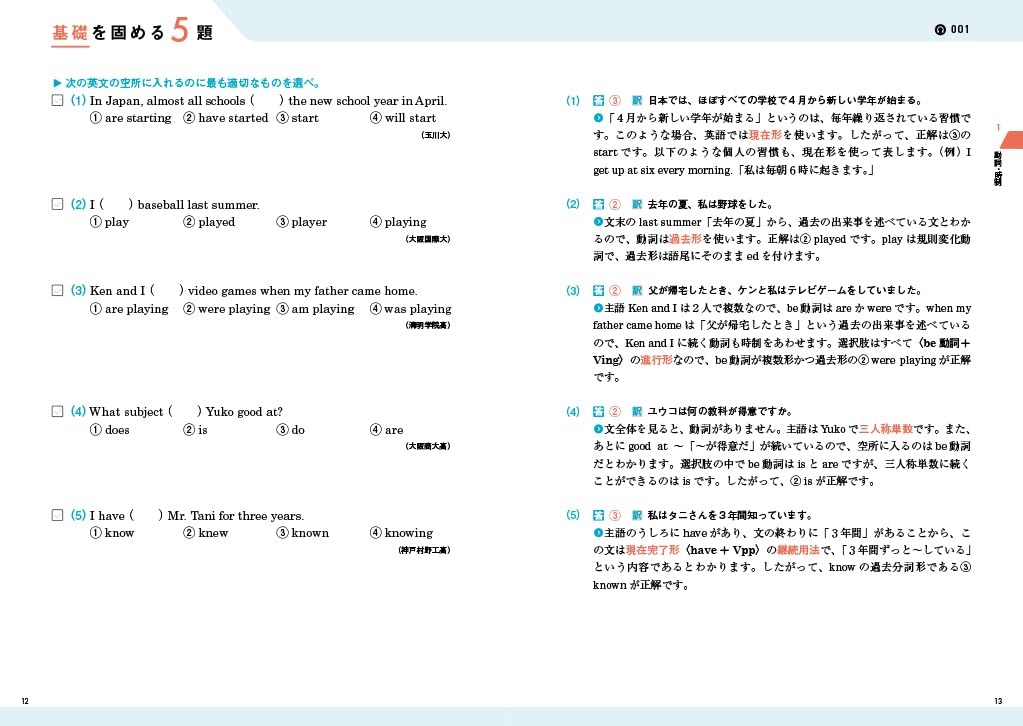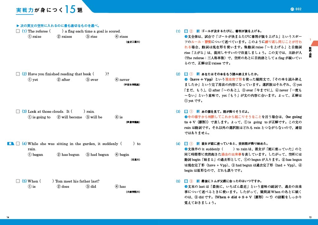 英文法は「要点まとめ」と「基礎を固める5題」で知識の定着を図った後、「実戦力が身につく15題」で実戦的な力を養います。