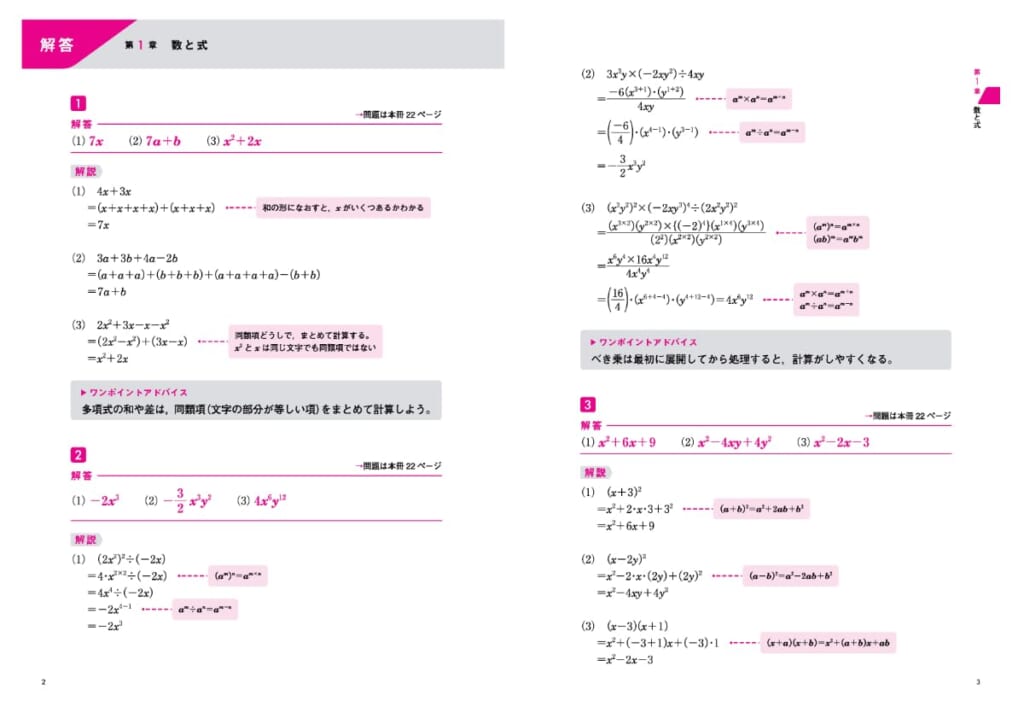 数学の解答・解説は別冊構成。単に答えを示すだけでなく、「ワンポイントアドバイス」で解き方のコツや着眼点、さらにその問題から何を学ぶべきかを丁寧に補足。初見の問題にも対応できる「考える力」を育てます。