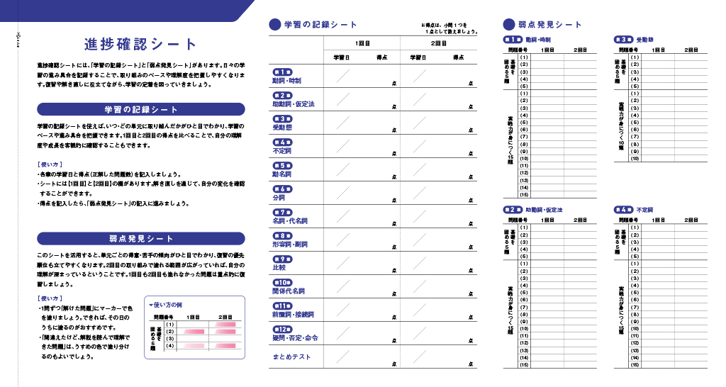 本シリーズには、日々の学習を振り返り、次につなげるためのサポートツールも充実。進捗確認シートでは、「何をやったか」「できた・できなかった」「学習日」などを記録することで、自分の努力を客観的に可視化できます。