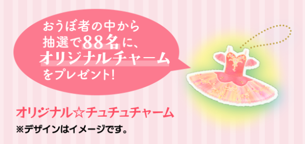 応募者の中から抽選で88名に、可愛いチュチュデザインの「リトル☆バレリーナ オリジナルチャーム」をプレゼントします。