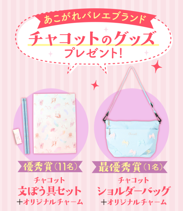 また、最優秀賞者1名、優秀賞者11名には、人気のバレエブランド「チャコット」のグッズと、オリジナルチャームをプレゼントいたします。
