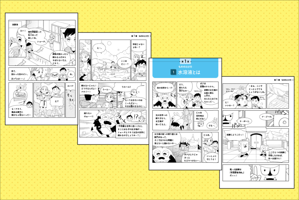 「まんがとして楽しむだけで終わってしまうのではないか?」――そんな心配はいりません。ビジュアルやストーリーが楽しめるまんがの特性を最大限活かし、「何が、どうして、どうなる」という流れや考え方がスルスル入ってくるよう工夫しています。まんがでしくみや理由をしっかりと理解することで、思考力が求められる問題にも対応できる応用力が自然と身につきます。