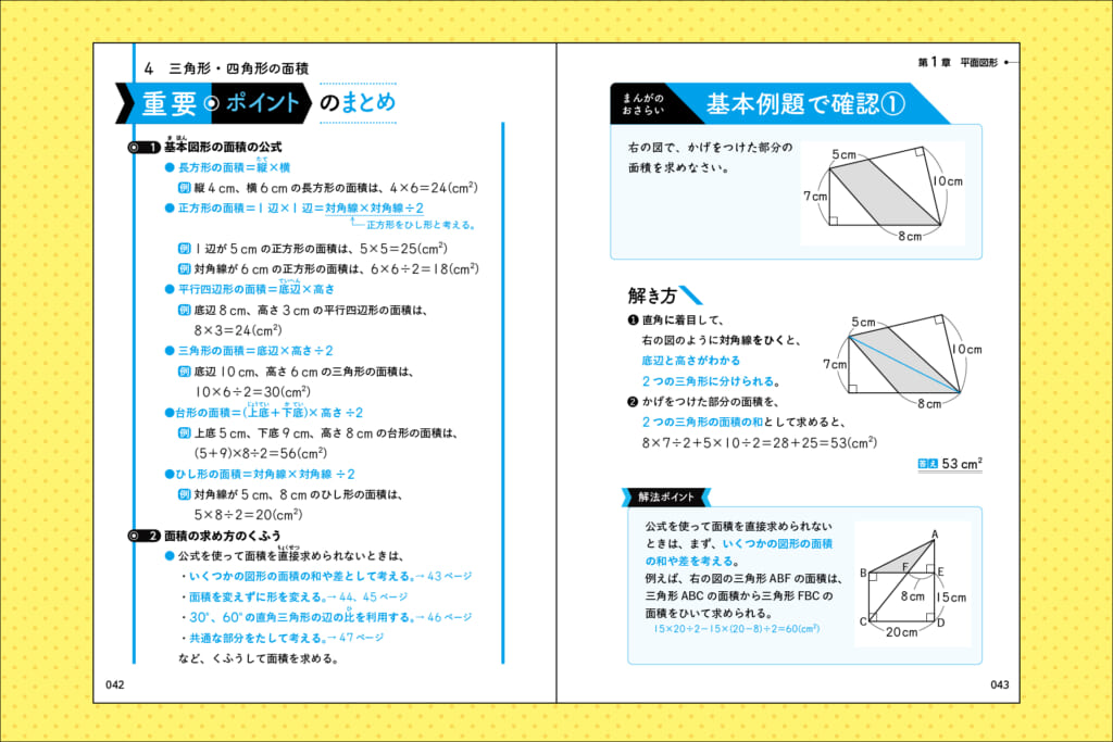 さらに各単元の終わりには、入試でよく出る「重要ポイントのまとめ」や、重要ポイントについて問う「基本例題」を豊富に収録しています。まんがで楽しく学んだあとに、しっかり確認・定着・応用できる仕組みになっています。