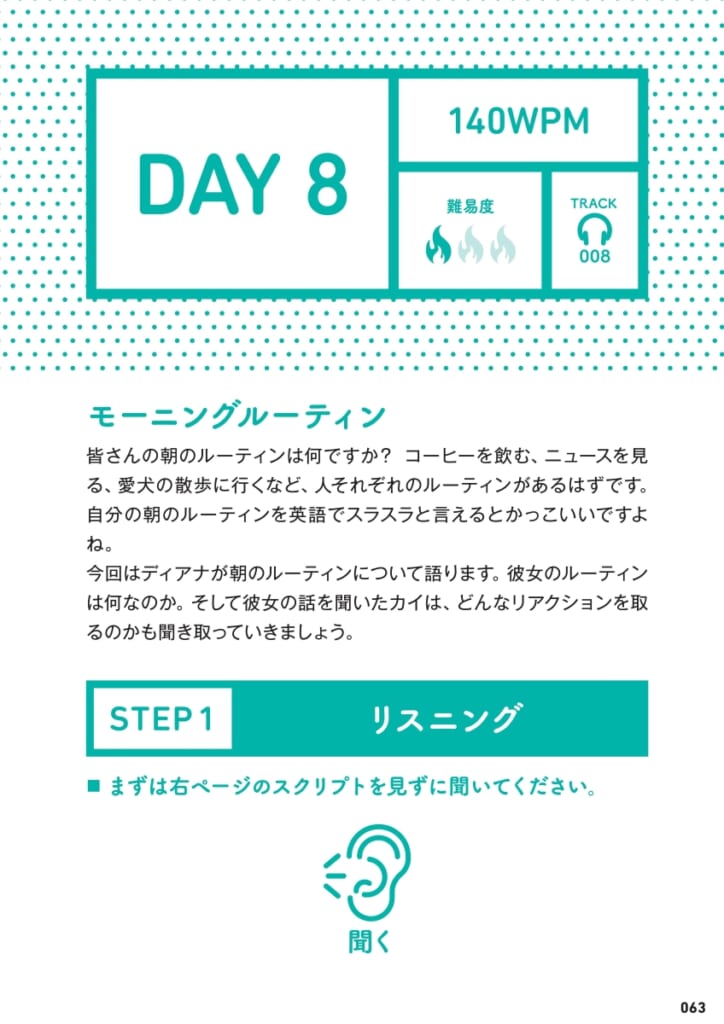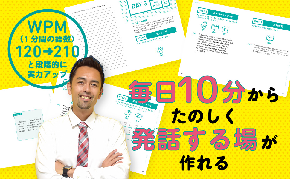 一般的に、ネイティブの平均200~250WPMに対し、日本人は80~100WPM程度と言われています。本書はレベルを3段階に設定し、徐々にスピード(WPM)が上がる構成です。25のレッスンを通して、外資系企業でも通用するリスニング力・スピーキング力を養います。
