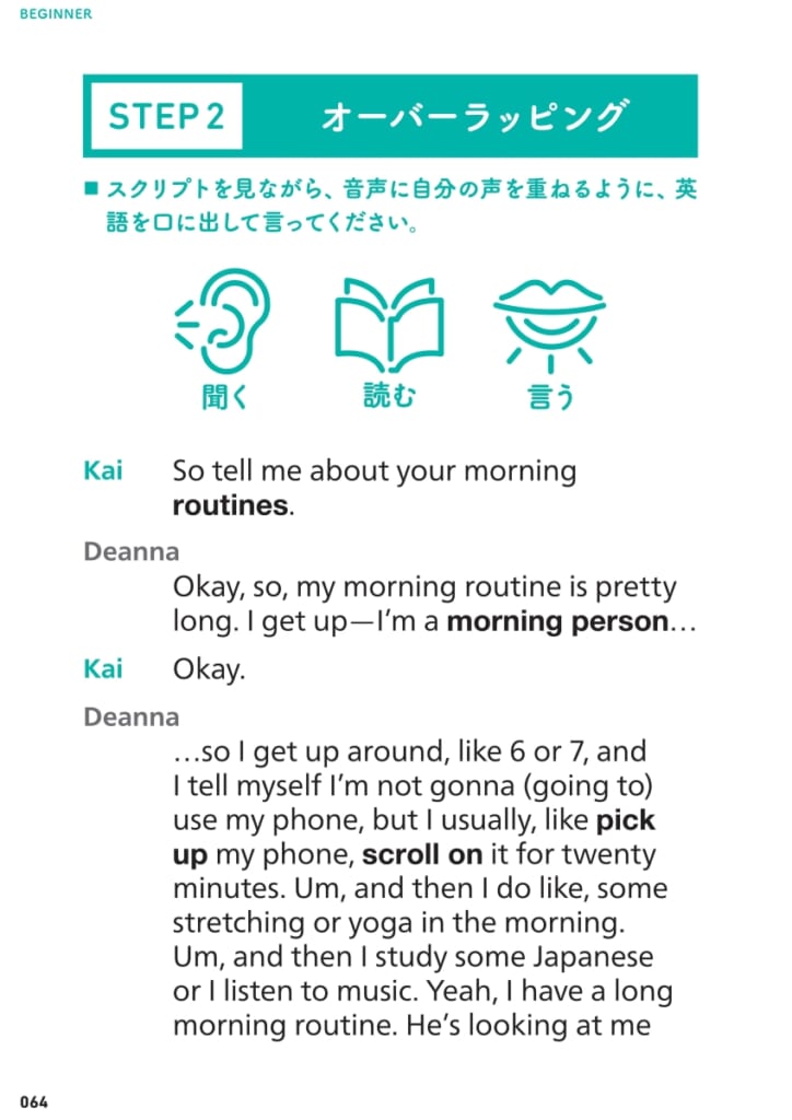 本書のリスニング教材は、教科書では学べない言い淀み、口癖、省略やスラングまで、ネイティブの日常会話をそのまま再現しています。1つの会話を【リスニング→オーバーラッピング→意味理解→短文シャドーイング→全文シャドーイング】の5ステップで徹底練習する構成となっており、シャドーイングを重ねるうちに、ネイティブ並みに聞き取れる・話せるスピードに近づくことができます。