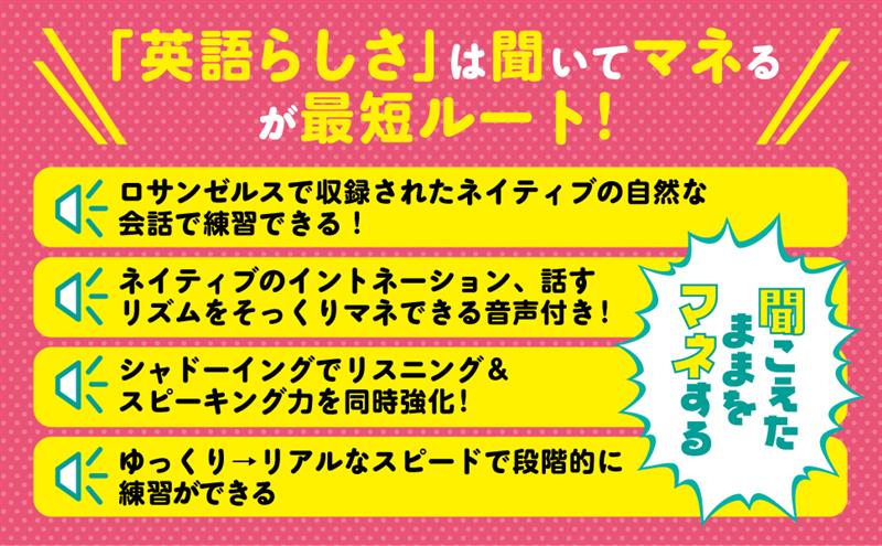 本書では、現地ロサンゼルスで台本なしに録音された「生きた英語」を繰り返しシャドーイングすることで、英語を聞き取る力と口に出す力(リスニング&スピーキング)を同時に身につけることができます。英会話に自信をつけたい人や、英検、TOEIC、TOFLEなどのスコア向上を目指す人にも役立ちます。