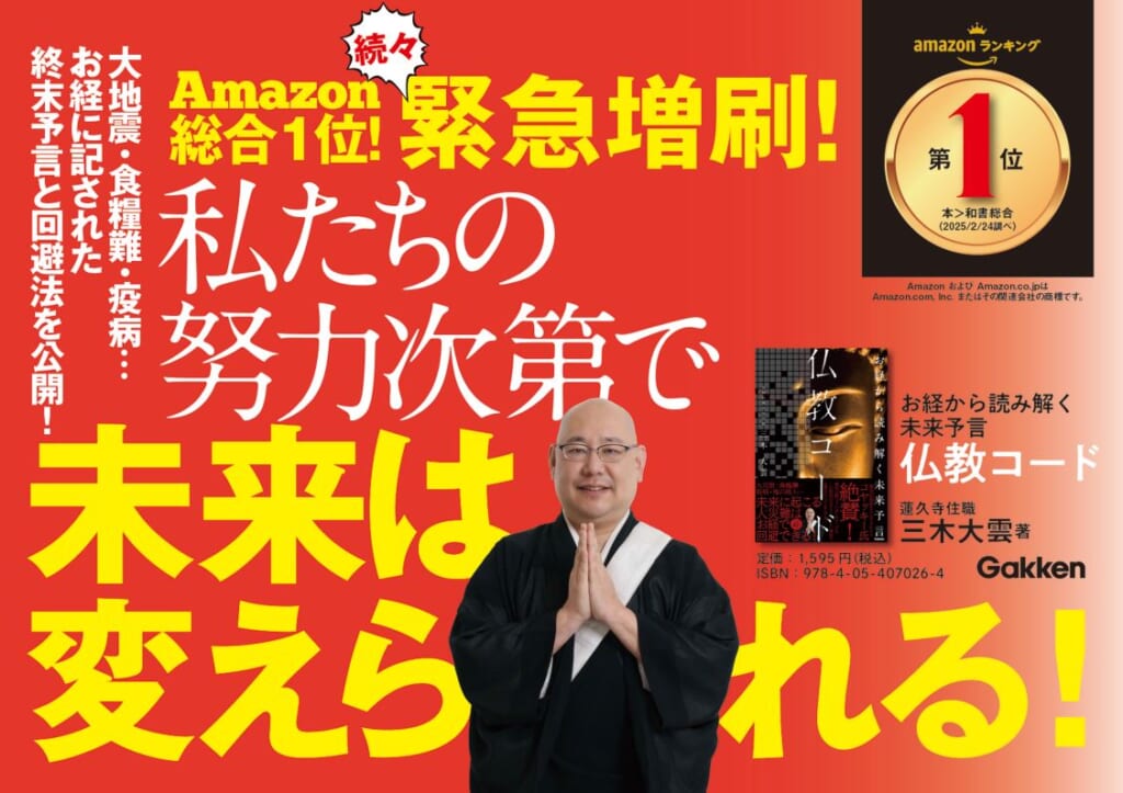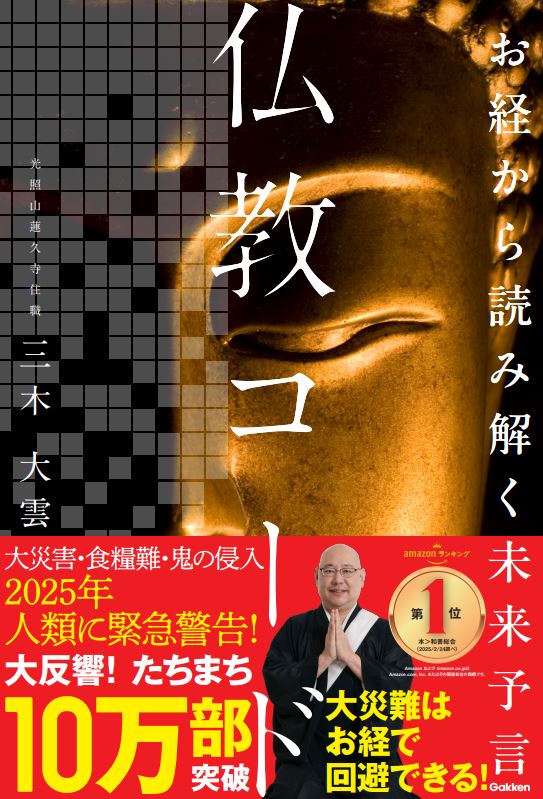 京都・蓮久寺の38代目住職でありながら、怪談話や不可思議な話を切り口に仏教への教えとつなぐ「怪談和尚」としても注目を集める三木大雲住職。講演会やYouTube等で大反響の「お経に記された未来予言」のお話を1冊にまとめた書籍が、『お経から読み解く未来予言 仏教コード』です。