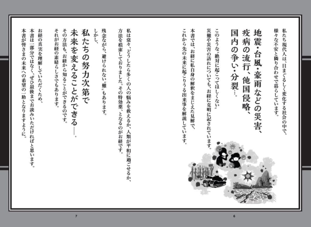 本書では“禁断のお経”といわれた『法華経(ほけきょう)』をはじめ、さまざまなお経を三木大雲住職が解読し、これから先、起こりうる出来事を詳しく解説しています。本書でも、お経や文献をベースに独自の解釈をまじえながら、近い未来についても予測を行い警鐘を鳴らしています。