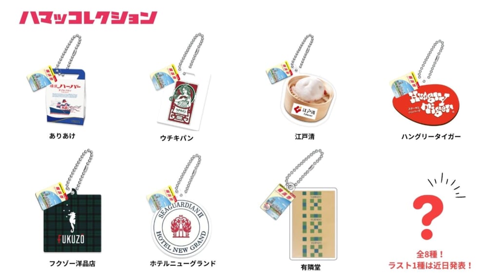 株式会社ありあけ、ウチキパン株式会社、株式会社江戸清、株式会社ハングリータイガー、有限会社フクゾー洋品店、株式会社ホテル、ニューグランド、株式会社有隣堂 (カプセルトイ企画制作・販売/株式会社ソライロ Tel 03-3400-3939) |
