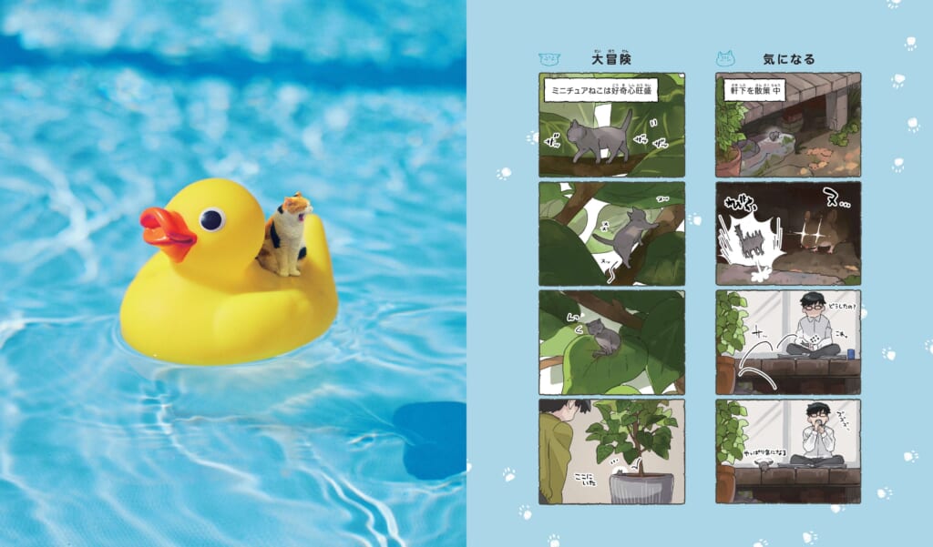 ▲写真とマンガでミニチュアねこの生態を紹介。