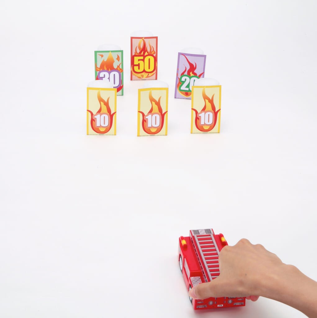 豪華ふろく①「プッシュで出動! ドデカしょうぼうしゃ」を走らせて、炎の的を倒すゲームに挑戦! 的はそのまま使ってもよし、飲料の小さなボトルに貼ってつかってもよしです。お子さまの年齢に合わせて使い分けられます。