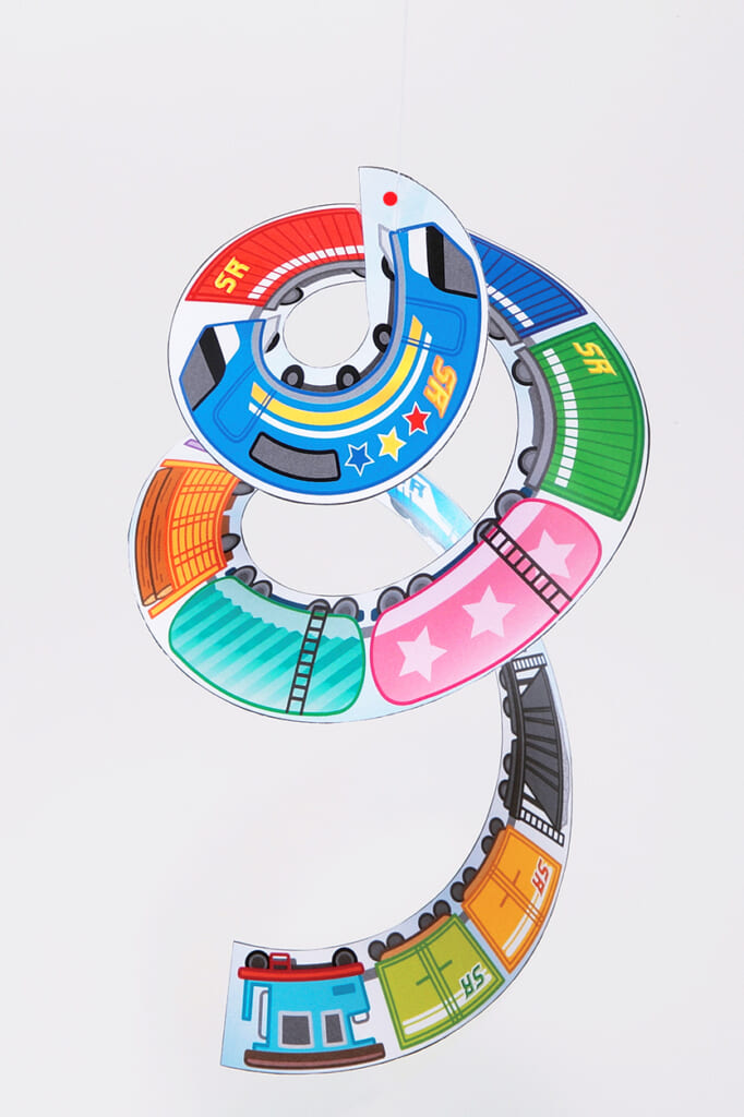 ひもで吊り下げれば、くるくる貨物列車が走り出す! かわいいモビールが作れます♪