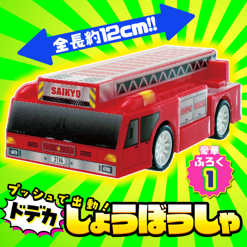 キッズ向けのりもの雑誌『最強のりものヒーローズ9-10月号』は、「プッシュで出動! ドデカしょうぼうしゃ」が付録! 前に転がして手を離すと、グングン走る消防車のおもちゃです。全長約12cmのドデカサイズで、小さなお子さまの手でも扱いやすくなっています。どれだけ長く走らせられるかチャレンジしたり、とじ込み付録の「しょうぼうまとあてゲーム」で的を倒したり、ざまざまな遊び方ができます!