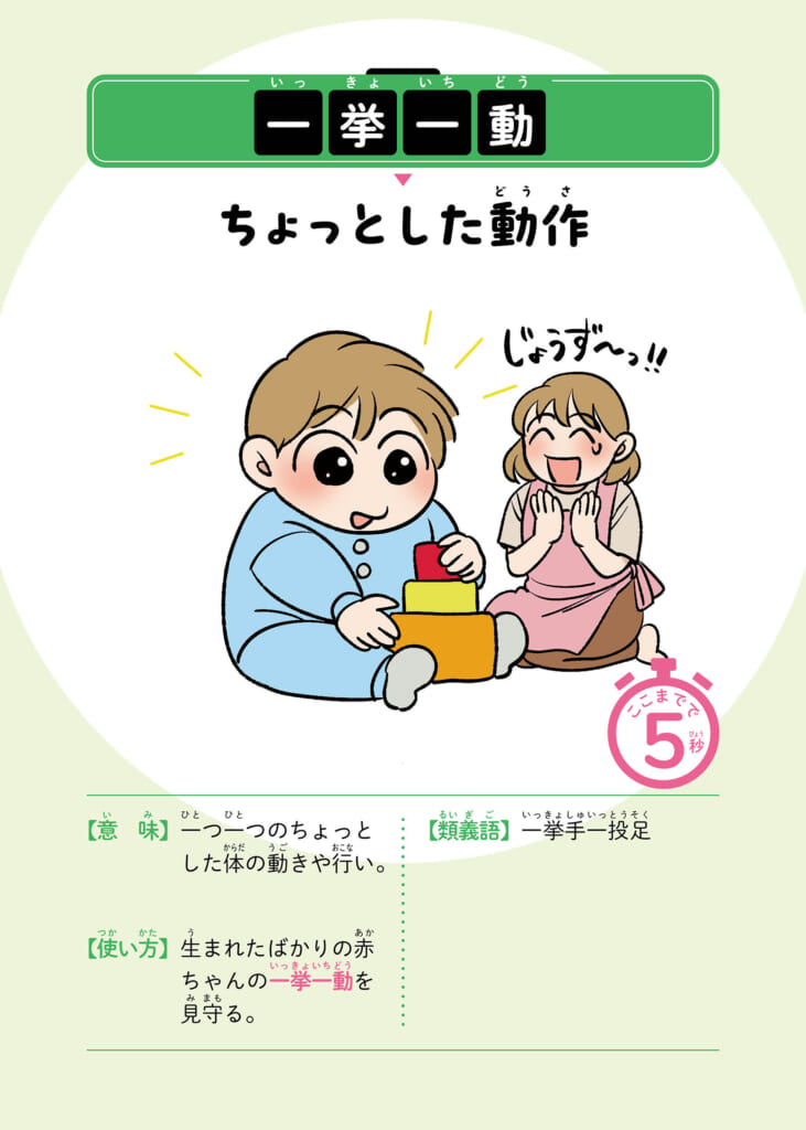 所要時間は1語につきたった5秒! 言いかえとイラストを見れば、すぐに言葉の意味がつかめます。たった5秒なので、読書や勉強が苦手な方でも大丈夫! 二学期からことわざの授業が始まる小学校3年生のお子さんや、中学受験に向けてがんばっている方、さくっと学びなおしたい方にもおすすめです。
