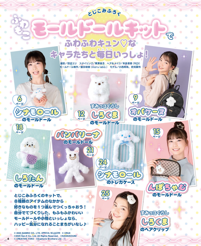 本書のとじこみふろく「ふわもこモールドールキット」でつくれるのは、下記の6キャラ♪
