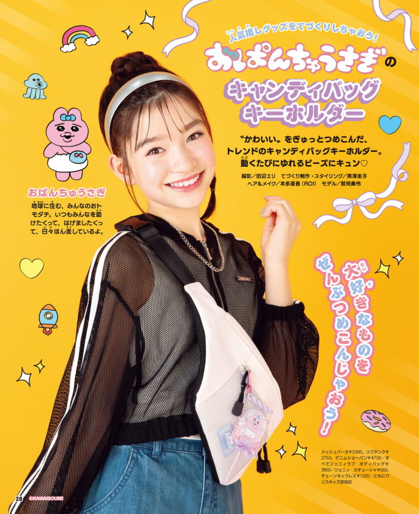 紙面には、チュール毛糸、カラフルビーズやフレーク、折り紙などを使って、人気キャラクターのファッション小物や、おしゃれアイテムをつくるアイデアも詰まっています。