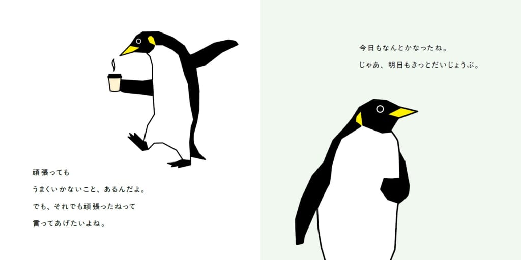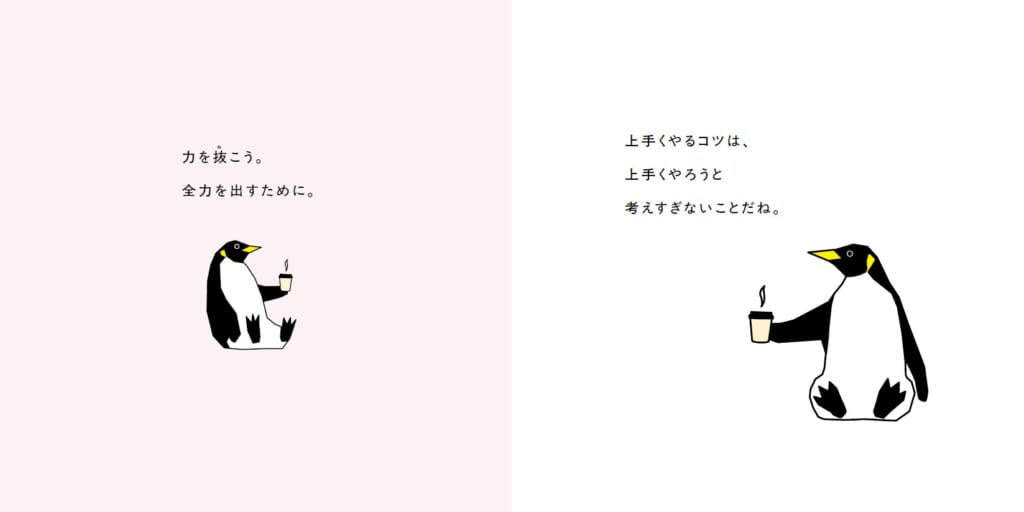 日々を頑張る人間を案ずるペンギンの優しい言葉が詰まった本書、ふと開いたページにきっと心を休めるヒントがあるはずです。