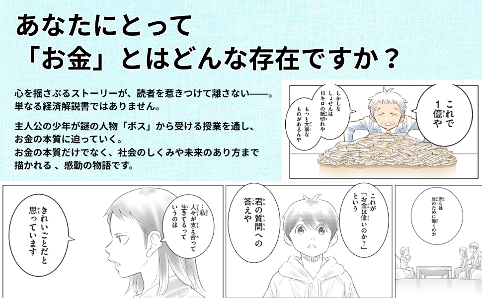 「将来は年収の高い仕事につきたい」――そう思っていた主人公、中学2年の優斗(ゆうと)は、ある日、七海(ななみ)と一緒に不思議な屋敷に行き、「ボス」と呼ばれる謎の男性に出会います。男性は言います。「お金の正体を理解できたら、この屋敷ごとあげてもいい」――。それからボスのお金の授業が始まりました。そして待ち受ける驚きの真実とは。