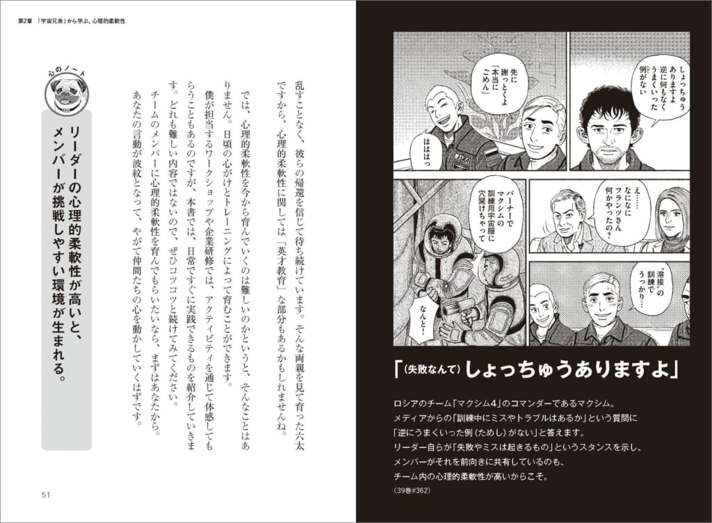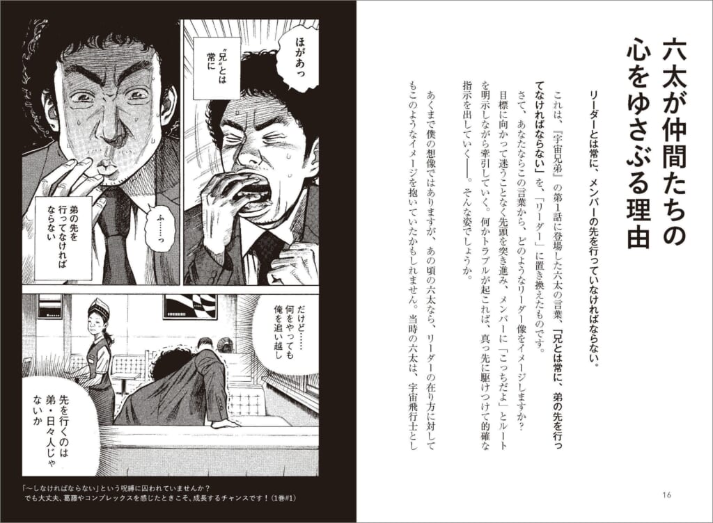 本書は、そんな『宇宙兄弟』の名ゼリフや名シーンを紹介しながら「制約主導アプローチ」に基づくチームづくりの新常識と、「心理的柔軟性」を重視した次世代リーダーシップについて、わかりやすく解説。チームワークやリーダーシップに悩んでいる人はもちろん、現代社会で働くすべての人にぜひ読んでほしい感銘必至なビジネスバイブルです。