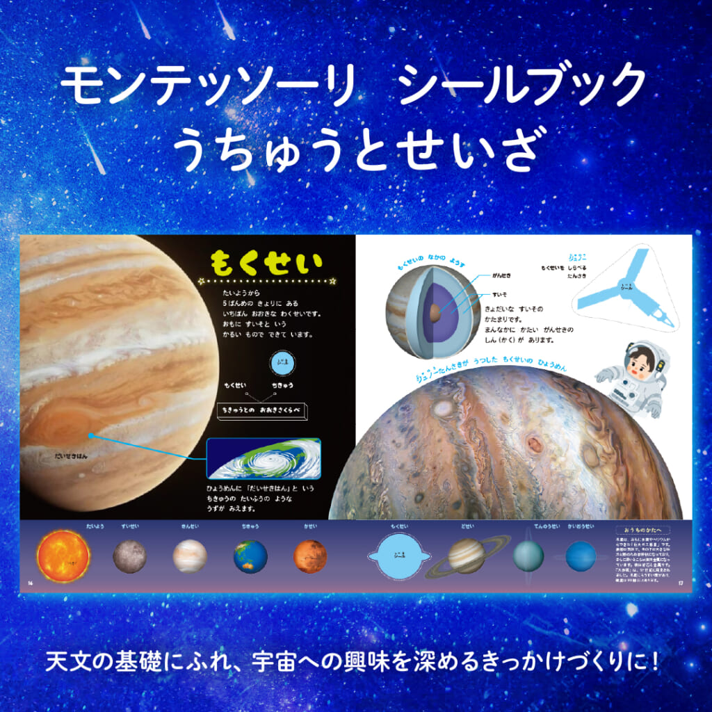 『モンテッソーリ シールブック うちゅうとせいざ』は、モンテッソーリの文化教育をベースに、惑星シールを貼りながら天文の基礎に触れるシールブック。