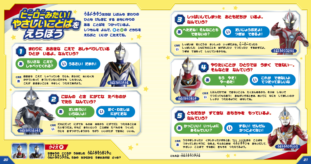 飽きずに読み進められるよう、言葉選びをクイズにした「ヒーローみたい!かっこいいことばをえらぼう」や困難やピンチをヒーローはどうやって乗り越えたのか紹介する「こんなときどうする?ヒーローのこたえ」などのページも。
