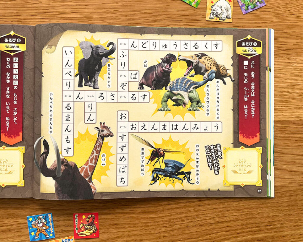 練習したひらがなは、シールはりやパズル、迷路などで楽しくおさらい!