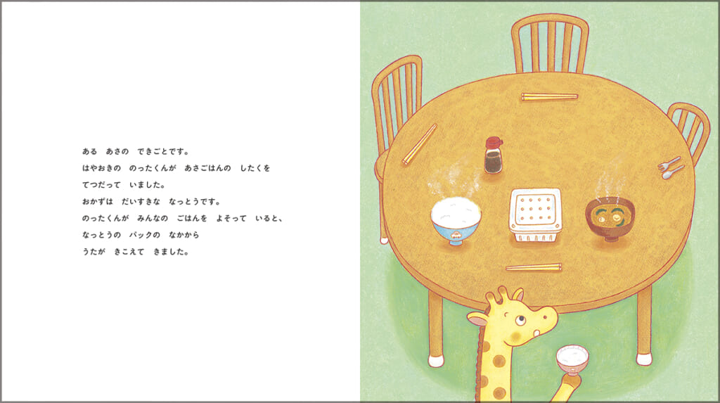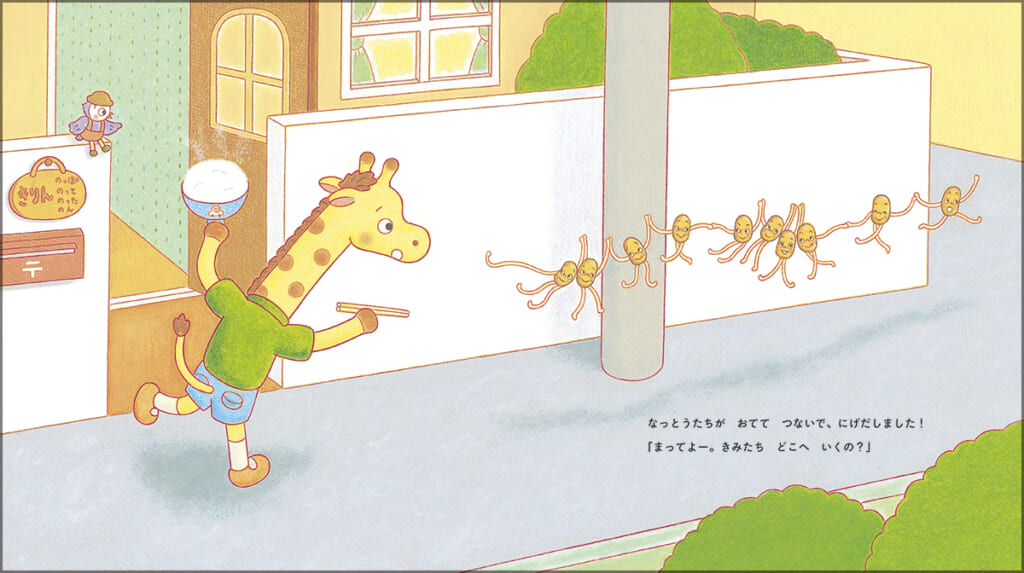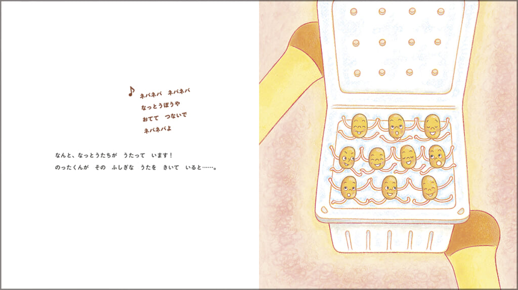 納豆を題材にしたのは、ちょうど夫が納豆を食べていたから。また、園児たちが手をつなぐ春の光景と、納豆の糸を引く様子が重なって、自然とこのお話が生まれました。