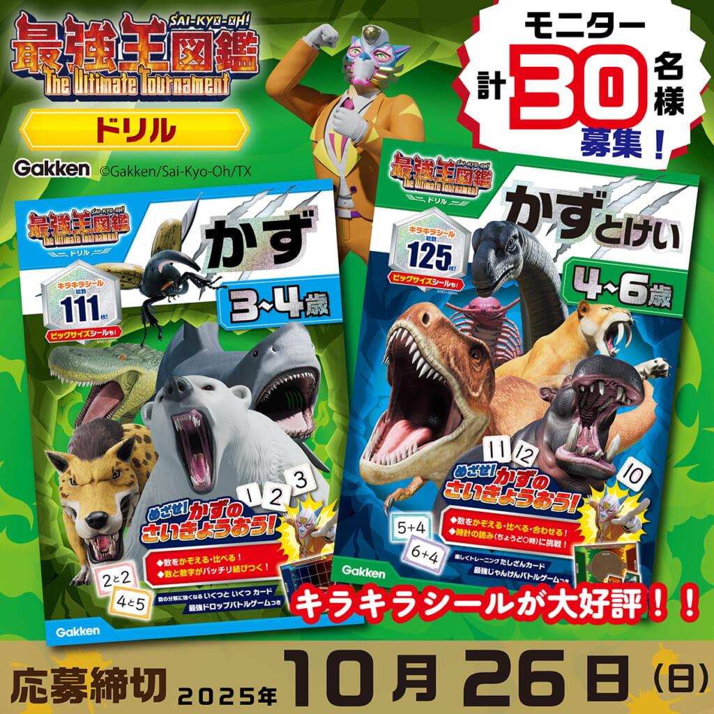 この発売を記念して、アニメ最強王図鑑×ドリル(幼児版)かず 3~4歳』か『かず とけい 4~6歳』のいずれかを実際にお使いいただき、「本書を使った感想」「本書を使用している画像や動画」をご自身のX(旧Twitter)かInstagramに投稿してくださるモニターを募集いたします。