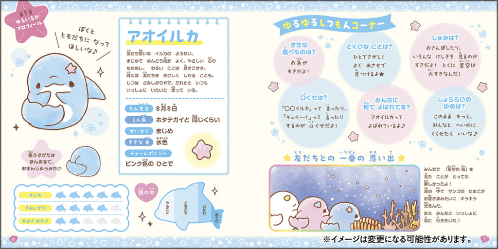 アオイルカやピンクイルカなど、全11キャラクターのプロフィールはもちろん、相関図や質問コーナー、ショートストーリーなど、ゆるいるかたちのことをもっと知ることができちゃうページがたっぷり。みいるか&ゆるいるかファン必携の一冊です。
