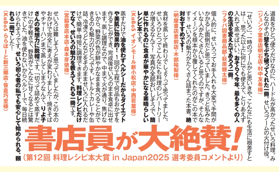 ・せいろブームの先駆けになった作品で、せいろが身近なものになるとは思わなかったのですごいと思いました。面倒くさいと思っていたせいろが、メインおかずも副菜も一気に作れる手軽な調理法で、しかも皿いらず。冬だけの調理器具だと思っていたら、ヘルシーで夏も食が進む、など、いろいろ便利なことが知れてよかったです。(紀伊國屋書店梅田本店・戸田晃代様)