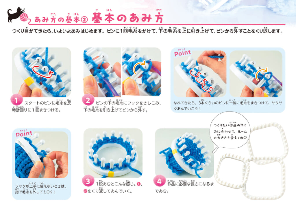 編み物ブームにのって子どもが編み物に初挑戦したけど、なかなか難しく、あきらめたというスタッフママたちの声から、編み機の「ニッティングルーム」をキットにしました。リリアン編みのような編み方なので、ハードルが低く、初心者でも帽子があっという間につくれます。人気のねこ耳帽子やしっぽのキーホルダーを自分でつくってみませんか?