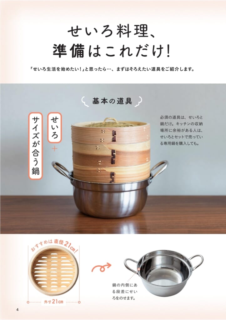 また、せいろビギナーの方に向けて、せいろの選び方や使い方、お手入れの仕方まで、写真つきでわかりやすく解説。「せいろは何段まで重ねて蒸せる?」「レシピどおりに作っても火が通らないときは?」など、SNSに寄せられた疑問にもお答えしています。