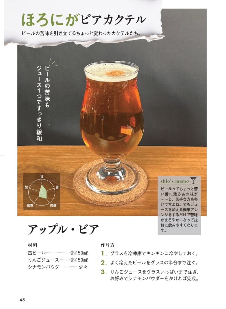 ひとりで楽しむもよし、友達や家族にふるまうもよし。しお【家飲み職人】の持つ、自由で突飛なアイデアが満載の本書があれば、カクテルづくりをもっと気軽に楽しめるようになること間違いなしです。