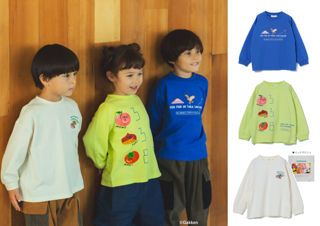 SNSでも話題の『新レインボー 写真でわかる はじめてことわざ・四字熟語辞典』から選ばれた、ことわざ・慣用句がデザインされたロングスリーブTシャツが、「BEAMS mini」の取り扱い店舗と、BEAMS公式オンラインショップにて販売スタート。「一富士二たか三なすび」「桃くり三年柿八年」「すし詰め」をイラストにして、刺繍とプリントで表現しています。