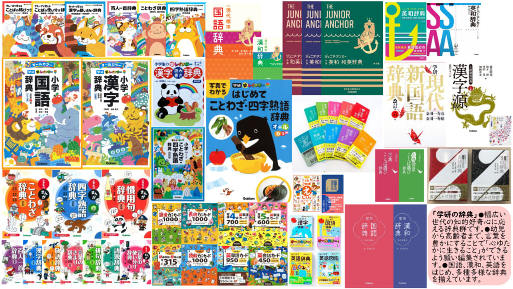 幼児から高齢者まで、言葉を豊かにすることで「心ゆたかに生きること」ができるよう願い編集されています。国語、漢和、英語をはじめ、多種多様な辞典を揃えています。