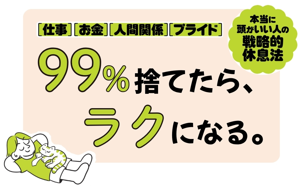 ひろゆきが伝えたいことは、「自分にとって大切な1%を優先して、99%を潔く捨て去る」こと。そのための考え方と、具体的に“力を抜くコツ”が詰まった一冊です。